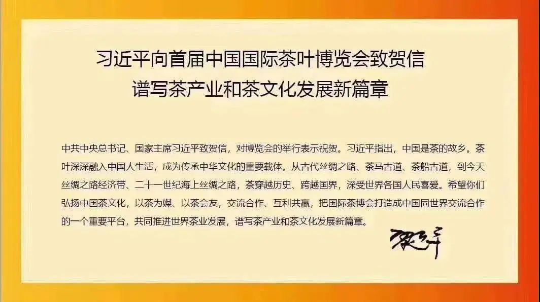 总书记向首届中国国际茶叶博览会致贺信指出,中国是茶的故乡,茶叶深深融入中国人生活,成为传承中华文化的重要载体。从古代丝绸之路、茶马古道、茶船古道,到今天丝绸之路经济带、二十世纪海上丝绸之路,茶穿越历史、跨越国界,深受世界各国人民喜爱。希望你们弘扬中国茶文化,以茶为媒、以茶会友,交流合作、互利共赢,把国际茶博会打造成中国同世界交流合作的一个重要平台,共同推进世界茶业发展,谱写茶产业和茶文化发展新篇章。