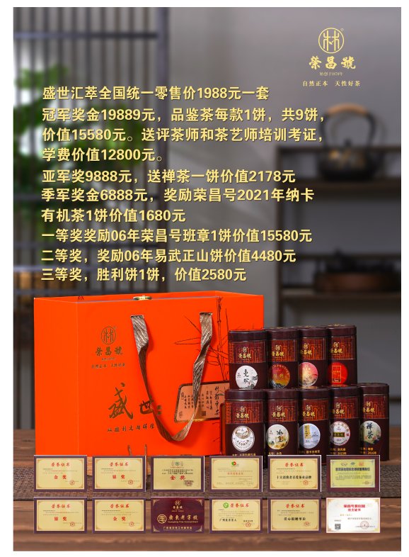 冠军奖金19889元,品鉴茶每款1饼,共9饼,价值15580元。送评茶师和茶艺师培训考证◇学费价值12800元。